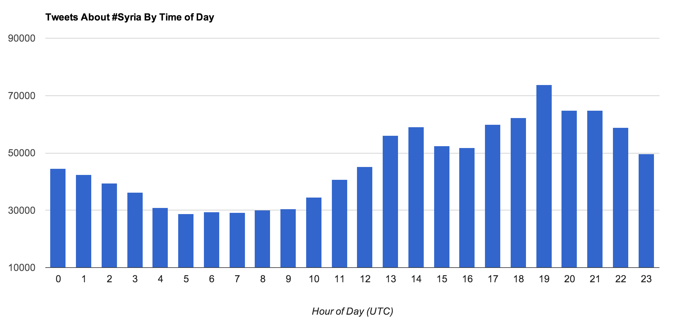 As a final consideration, let’s briefly explore the time of day in which tweets are being authored. The following chart displays the number of tweets authored by hour and is standardized to UTC (London) time. In mentally adjusting the time, recall that London is 5 hours ahead of the East Coast (EST) and 8 hours ahead of the West Coast (PST).